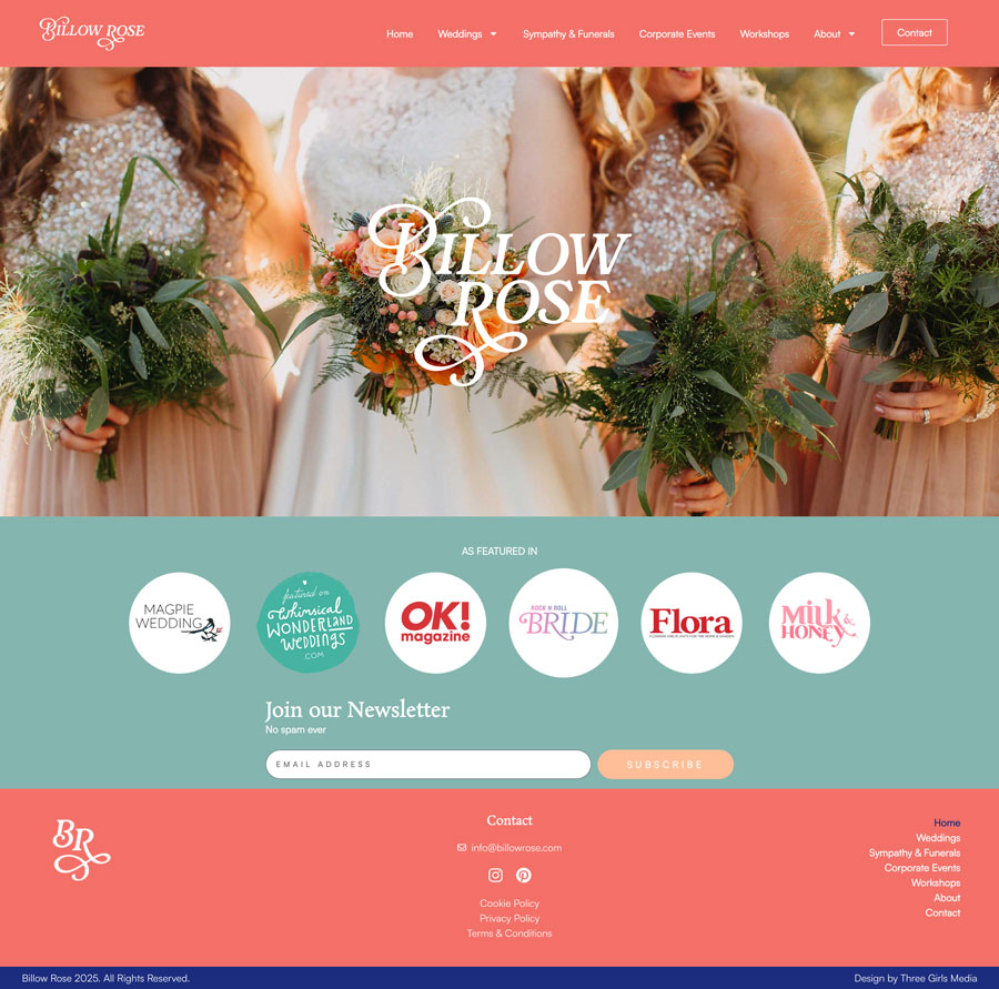 We are thrilled to have just launched the newly designed website for Billow Rose Florists, an established wedding and event florist based in Westerham, Kent. The primary objective for the new Billow Rose website was to create a visually stunning and user-friendly website that reflects the elegance and artistry of their floral designs. Our team embarked on a comprehensive redesign process to achieve this, focusing on aesthetic appeal and functional enhancements to ensure an intuitive user experience. We initiated the project with an in-depth analysis of Billow Rose’s brand identity and target audience. This allowed us to tailor a website design that not only resonates with their clientele but also enhances their brand’s digital footprint. The new website features a clean, modern layout with a sophisticated colour palette that complements Billow Rose’s branding. High-quality imagery showcases their floral arrangements and past projects, giving prospective clients a vivid insight into the creativity and quality of their work. Our services for this project included bespoke web design, responsive development, and search engine optimization (SEO). The responsive design ensures that the website offers a seamless experience across all devices, from desktops to mobile phones, which is crucial for today’s mobile-first audience. SEO was a critical component of our strategy, focusing on improving organic search visibility so that potential customers can easily find Billow Rose online. Additionally, we integrated a user-friendly content management system (CMS) that allows the Billow Rose team to easily update content, add new pages, and manage constantly changing galleries of images. This allows them to keep their website fresh and relevant, which is vital for engaging visitors and improving SEO rankings. The feedback from the client and their customers has been overwhelmingly positive, with an increase in online enquiries and enhanced engagement on the website. This project not only demonstrates our ability to create stunning and effective websites but also reinforces our role as a partner in our clients’ digital growth. Three Girls Media is proud to have delivered a tailored digital solution that exceeded their expectations.  Read the lovely testimonial from Coralie, the founder, below. Visit Website